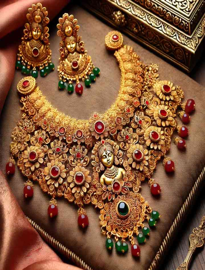 A traditional antique gold-plated temple jewelry set with intricate goddess motifs. The necklace features red and green gemstones, accompanied by matching earrings. Ideal for bridal and festive wear.