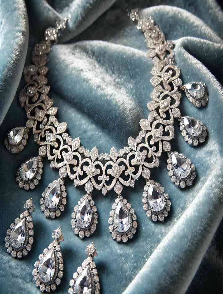 A dazzling silver-plated zircon-studded necklace set with teardrop-shaped stones and intricate patterns. The jewelry includes a matching pair of earrings, ideal for party and evening wear.
