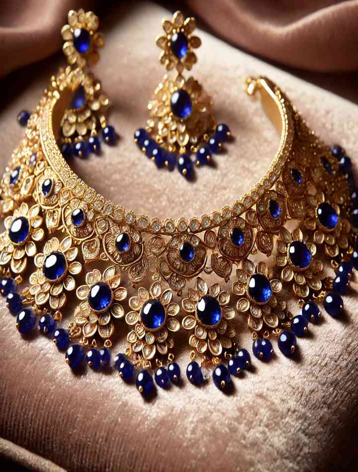 A royal blue stone-studded choker set with gold plating. The choker is embellished with intricate patterns and complemented by matching earrings. Ideal for bridal and festive wear.